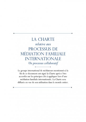 Cette charte publiée en 2017, est le fruit d'un groupe de travail international composé de 55 médiateurs professionnels provenant des sept continents. Toutes les structures spécialisées dans la médiation familiale internationale qui sont établies et reconnues à travers le monde font partie de ce Processus Collaboratif. En tant que document international de référence, La Charte doit servir à renforcer le dialogue et la coopération entre les médiateurs et les autorités administratives et juridiques ; c'est pour cette raison que ce groupe a amorcé son travail en parallèle à une conférence internationale sur la protection de l'enfance, se concentrant en particulier sur la Convention de La Haye de 1996 (lire Rapport de la Conférence).