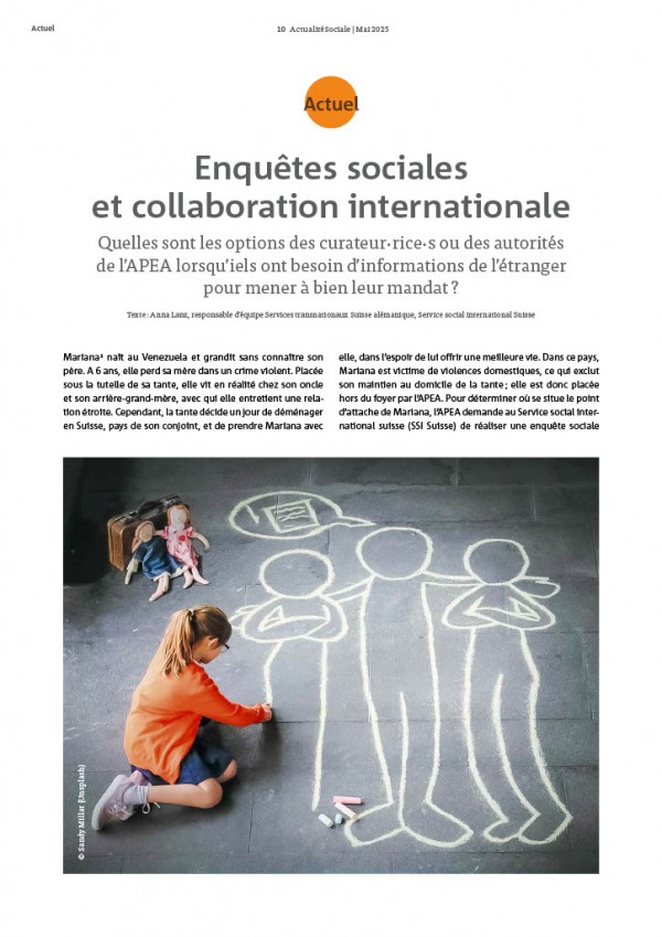 Anna Lanz, responsable d'équipe Services transnationaux pour le bureau zurichois du SSI Suisse, explique dans cet article qu'elle a rédigé pour la revue ActualitéSociale (revue spécialisée du travail social en Suisse romande), comment le SSI Suisse collabore avec un réseau mondial dans 120 pays pour fournir des rapports sociaux, localiser des personnes et mener des dialogues avec les parents, les proches et les enfants.