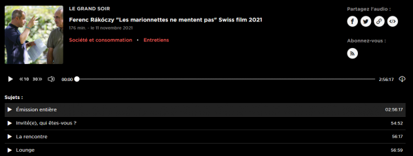 L'émission "Le Grand Soir" de la RTS, à reçu en direct Elodie Antony, responsable opérationnelle, sur le thème de la recherche du père biologique et inconnu, aux côté du psychiatre, écrivain et réalisateur Ferenc Rákóczy qui sortira prochainement un film intitulé "Les marionnettes ne mentent pas" traitant de cette thématique de travail du SSI Suisse.